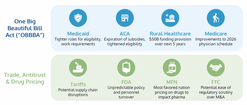 Other regulatory forces have also garnered significant headlines but, to date, have not generated material structural impact. Trade policy and tariffs present potential supply-chain friction—particularly for medtech and life sciences—but effects have been uneven and largely manageable for companies with domestic manufacturing footprints and healthy margins. Similarly, drug pricing rhetoric has outpaced policy action, with implemented measures remaining narrow in scope; however, drug affordability remains a stated priority of the Administration, suggesting this area warrants close monitoring. Ongoing policy direction shifts and personnel turnover at the Food and Drug Administration (FDA) have introduced near-term uncertainty around review timelines, though these disruptions have not yet translated into widespread operational impact, and the timing of a return to stability remains unclear. Finally, antitrust enforcement has begun to ease, with early signals pointing toward a more permissive posture on healthcare M&A.
