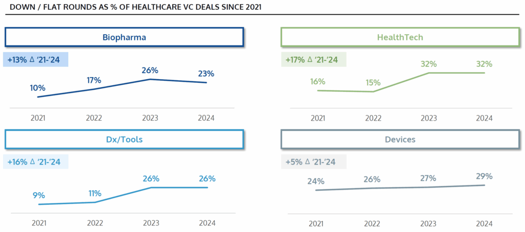SVB data shows that the share of flat and down rounds for venture-backed healthcare companies increased from 2021 to 2024 across all sub-sectors. While 2025 data is not yet available, our portfolio experience and current deal flow suggest this trend has only intensified. We are also increasingly seeing punitive pay-to-play structures that can significantly dilute—or effectively wipe out—existing shareholders who do not participate pro rata.
